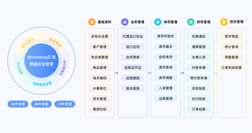 外贸信息化管理体系:架构迭代升级、定制化功能开发、多端数据互通、BI智能分析。按需定制进口业务管理核心模块,完成多业务软件接口无缝对接;BI高级分析功能,为管理层提供精准决策性数据,实现资金与货物在业务帐与财务帐的动态一致性。
