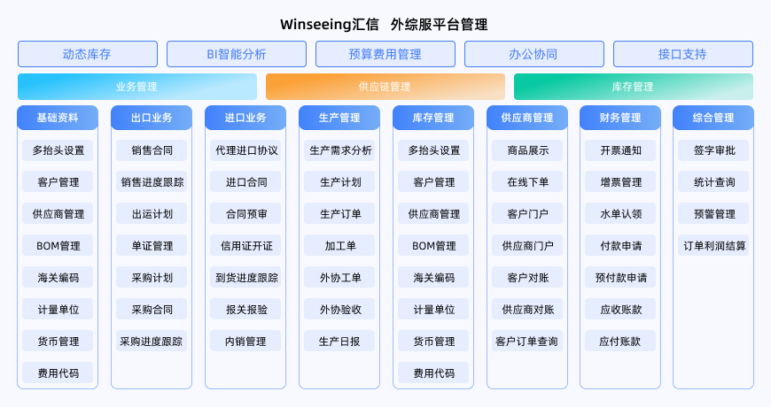 外贸信息化管理体系:架构迭代升级、定制化功能开发、多端数据互通、BI智能分析。按需定制进口业务管理核心模块,完成多业务软件接口无缝对接;BI高级分析功能,为管理层提供精准决策性数据,实现资金与货物在业务帐与财务帐的动态一致性。